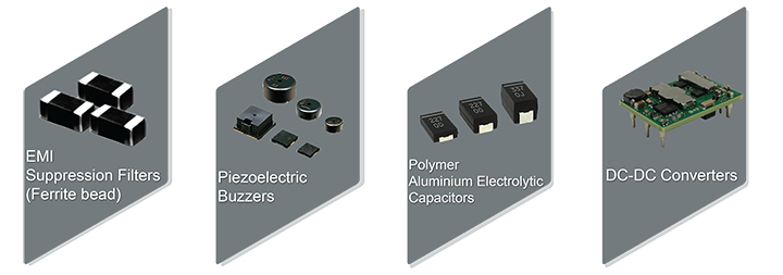 | Network and Communications | 1.EMI Suppression Filters (Ferrite bead) 2.Piezoelectric Buzzers 3.Polymer Aluminium Electrolytic Capacitors 4.DC–DC Converters | AS-05_02_Network_and_Communications.png | ダウンロード |
