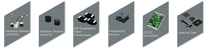 | Automotive | 1.Ultrasonic Sensors (MAWTR) 2.Ultrasonic Sensors (MAOPN) 3.EMI Suppression Filters (Ferrite bead) 4.Piezoelectric Buzzers 5.DC–DC Converters 6.Antenna Coils | AS-05_01_Automotive.png | ダウンロード |