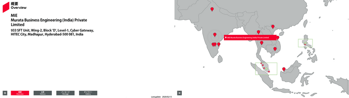 | 13 | 東南アジア | 17.446818 | 78.37698 | BEI | Murata Business Engineering (India) Private Limited | No 5, Q 1, A 2, Fifth Floor, Quadrant 1, Cyber Towers, Hitech City, Madhapur, Hyderabad ‒ 500081 Telengana, India | Sales Office | 0 | Overview | History | Message | Gallery | Free0 英語 | Free1 英語 | Free2 英語 | 2023/07/26 |