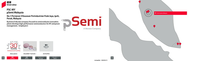 | 51 | 東南アジア | 4.52241 | 101.125677 | PSC-MY | pSemi Malaysia | No.1 Persiaran 9 Kawasan Perindustrian Pulai Jaya, Ipoh, Perak, Malaysia | A Murata company focused on semiconductor innovation. pSemi develops high-performance semiconductors for RF and power management. | 5 | Overview | History | Message | Gallery | Free0 英語 | Free1 英語 | Free2 英語 | 2020/09/21 |