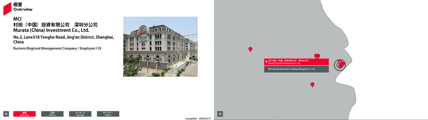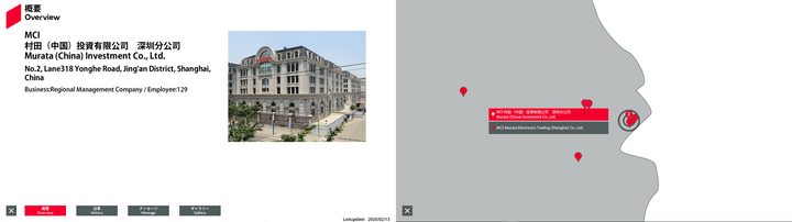 | 14 | 東アジア | 31.227021 | 121.48292 | MCI | Murata (China) Investment Co., Ltd. | 11/Floor,5 Corporate Avenue,150 Hubin Road, Huangpu District, Shanghai 200021, China | Regional Management Company | 129 | Outline | History | Message | Gallery | Free0 英語 | Free1 英語 | Free2 英語 | 2025/06/18 |
