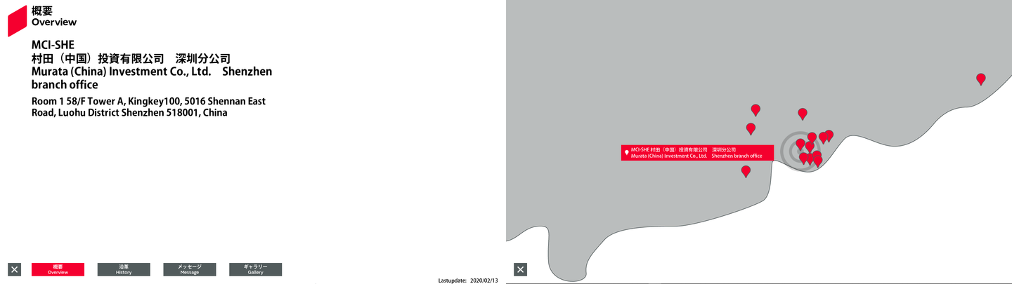15 東アジア 22.584322 113.971634 MCI-SHE 村田(中国)投資有限公司 深圳分公司 0 概要 沿革 メッセージ ギャラリー Free0 日本語 Free1 日本語 Free2 日本語 2020/09/21