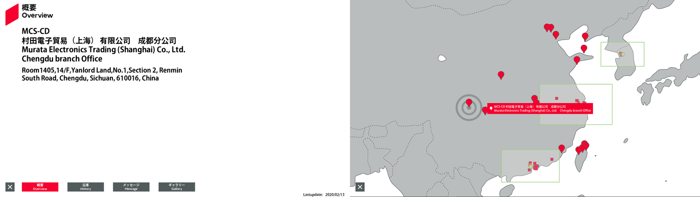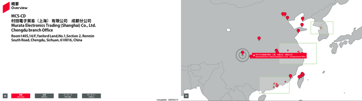 | 21 | 東アジア | 30.651968 | 104.066695 | MCS-CD | Murata Electronics Trading (Shanghai) Co., Ltd. Chengdu branch Office | Room1405,14/F,Yanlord Land,No.1,Section 2, Renmin South Road, Chengdu, Sichuan, 610016, China | 0 | Overview | History | Message | Gallery | Free0 英語 | Free1 英語 | Free2 英語 | 2020/09/21 |