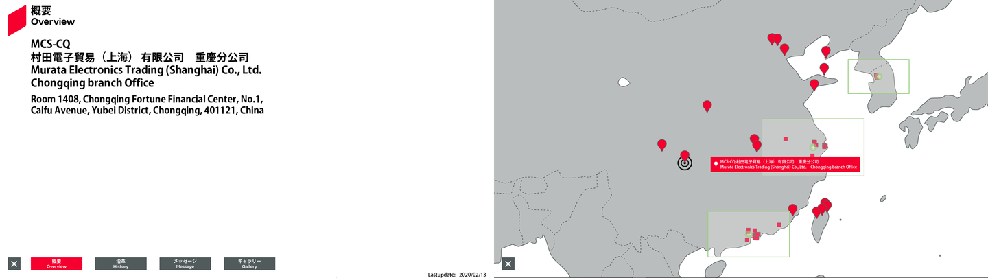 22 東アジア 29.610935 106.512259 MCS-CQ 村田電子貿易(上海) 有限公司 重慶分公司 0 概要 沿革 メッセージ ギャラリー Free0 日本語 Free1 日本語 Free2 日本語 2020/09/21