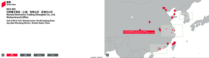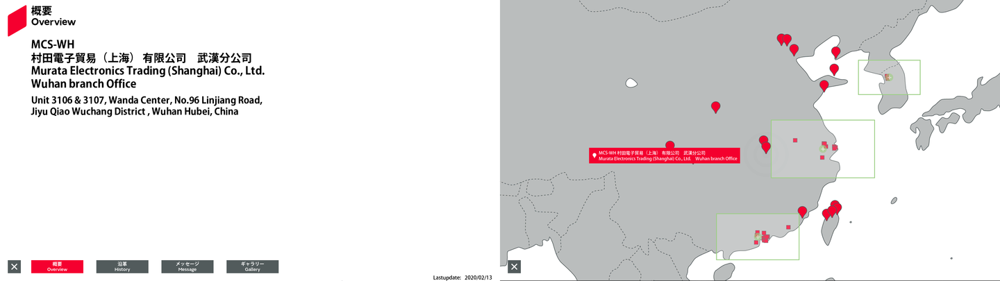 | 24 | 東アジア | 30.569431 | 114.236375 | MCS-WH | Murata Electronics Trading (Shanghai) Co., Ltd. Wuhan branch Office | Unit 3106 & 3107, Wanda Center, No.96 Linjiang Road, Jiyu Qiao Wuchang District , Wuhan Hubei, China | 0 | Overview | History | Message | Gallery | Free0 英語 | Free1 英語 | Free2 英語 | 2020/09/21 |