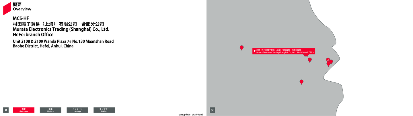| 25 | 東アジア | 31.856081 | 117.301524 | MCS-HF | 村田電子貿易(上海) 有限公司 合肥分公司 | 中国安徽省合肥市怀宁路288号置地广场A座1309-1310号 | 0 | 概要 | 沿革 | メッセージ | ギャラリー | Free0 日本語 | Free1 日本語 | Free2 日本語 | 2021/01/14 |