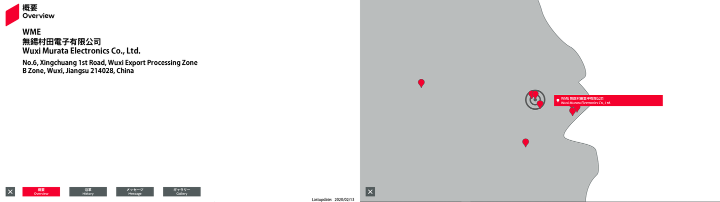 | 38 | 東アジア | 31.5509 | 120.432987 | WME | 無錫村田電子有限公司 | 無錫出口加工区B区行创一路6号 | 主はセラミックスの材質で電子部品の開発・設計・生産 | 9190 | 概要 | 沿革 | メッセージ | ギャラリー | Free0 日本語 | Free1 日本語 | Free2 日本語 | 2024/09/26 |