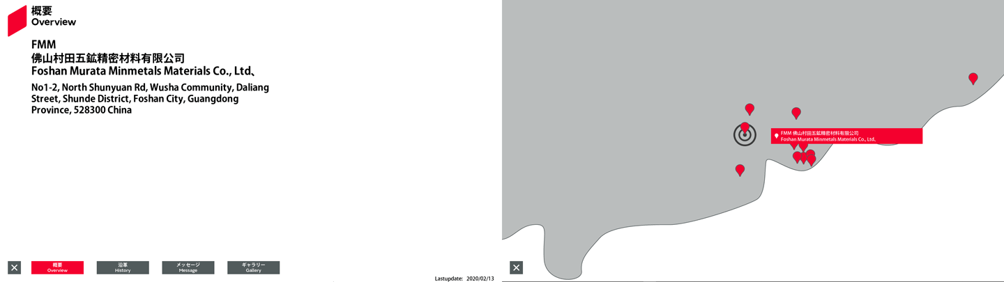 | 41 | 東アジア | 22.838477 | 113.253657 | FMM | Foshan Murata Materials Co., Ltd. | No1-2, North Shunyuan Rd, Wusha Community, Daliang Street, Shunde District, Foshan City, Guangdong Province, 528300 China | 0 | Outline | History | Message | Gallery | Free0 英語 | Free1 英語 | Free2 英語 | 2023/07/26 |