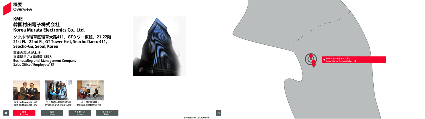 | 42 | 東アジア | 37.497772 | 127.026182 | KME | Korea Murata Electronics Co., Ltd. | GT Tower East, 411, Seocho-daero Seocho-gu, Seoul, 06615, Korea | Regional Management Company Sales Office | 230 | Outline | History | Message | Gallery | Free0 英語 | Free1 英語 | Free2 英語 | 2025/04/11 |