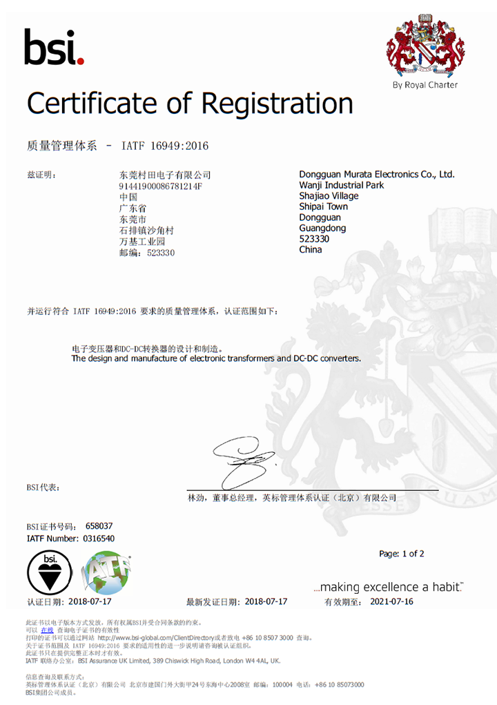 | International Automotive Task Force (IATF) 16949 | The Dongguan, China facility received IATF16949 certification in August of 2018. The International Automotive Task Force (IATF) certification provides a roadmap of continuous improvement for Dongguan’s quality management system, with the goal of satisfying and exceeding our customer’s expectations. Meeting this quality management standard gives the Dongguan facility the credibility to manufacture the high–quality products required by the automotive and vehicular markets. | CN-46_IATF_16949-1.png | ダウンロード |