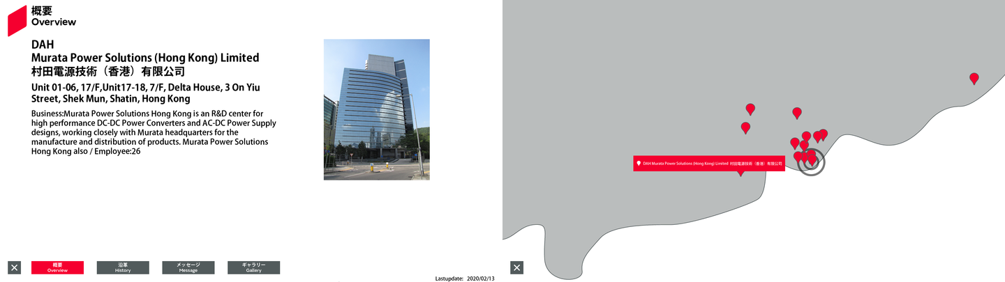 | 47 | 東アジア | 22.390364 | 114.209422 | DAH | Murata Power Solutions (Hong Kong) Limited | Unit 01-06, 17/F,Unit17-18, 7/F, Delta House, 3 On Yiu Street, Shek Mun, Shatin, Hong Kong | Murata Power Solutions Hong Kong facility is a research and development center for AC-DC and DC-DC products. The Hong Kong site works with Murata's headquarters for the development of products that are offered in custom, standard and modified-standard va | 27 | Outline | History | Message | Gallery | Free0 英語 | Free1 英語 | Free2 英語 | 2021/09/28 |