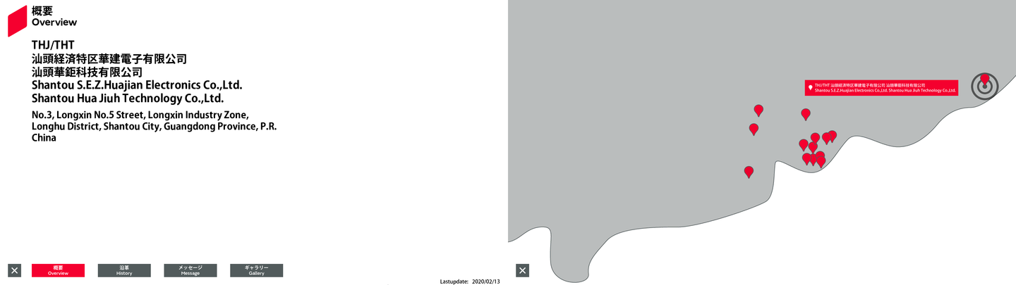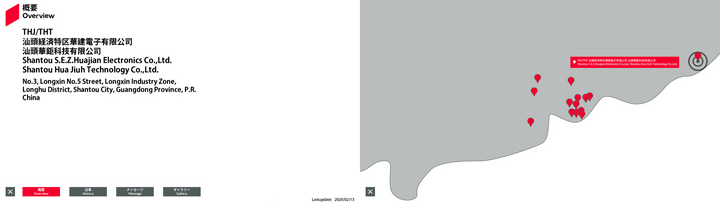 | 57 | 東アジア | 23.642283 | 116.584608 | THJ/THT | Shantou S.E.Z.Huajian Electronics Co.,Ltd. Shantou Hua Jiuh Technology Co.,Ltd. | No.3, Longxin No.5 Street, Longxin Industry Zone, Longhu District, Shantou City, Guangdong Province, P.R. China | 0 | Overview | History | Message | Gallery | Free0 英語 | Free1 英語 | Free2 英語 | 2020/09/21 |