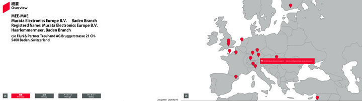 | 4 | ヨーロッパ | 47.190895 | 8.307192 | MEE-MAE | Murata Electronics Europe B.V. Baden Branch Registerd Name: Murata Electronics Europe B.V. Haarlemmermeer, Baden Branch | c/o Fluri & Partner Treuhand AG Bruggerstrasse 21 CH-5400 Baden, Switzerland | 0 | Overview | History | Message | Gallery | Free0 英語 | Free1 英語 | Free2 英語 | 2020/09/21 |