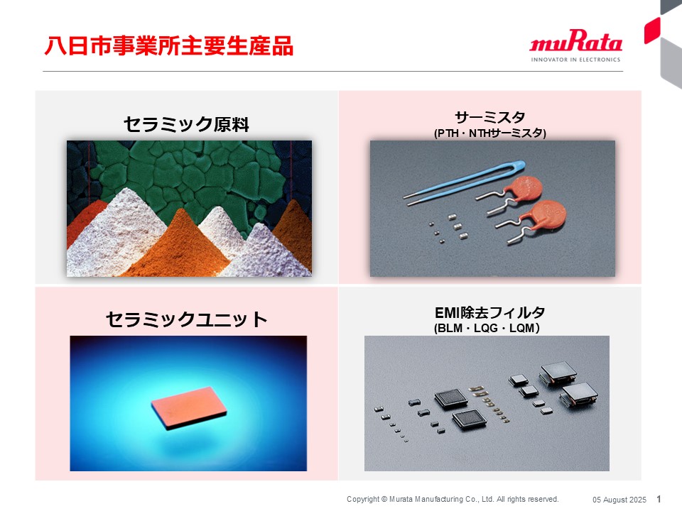 | 「主要生産品」八日市の製造しているもの | 「源流からのものづくり」を支える拠点―それが八日市事業所です。セラミック原料、セラミック素子を国内外のムラタ生産拠点に共有するとともに、EMI除去フィルタ、サーミスタをはじめとする完成品も生産し、世界中のお客様に届けています。 | JP-04.jpg | ダウンロード |