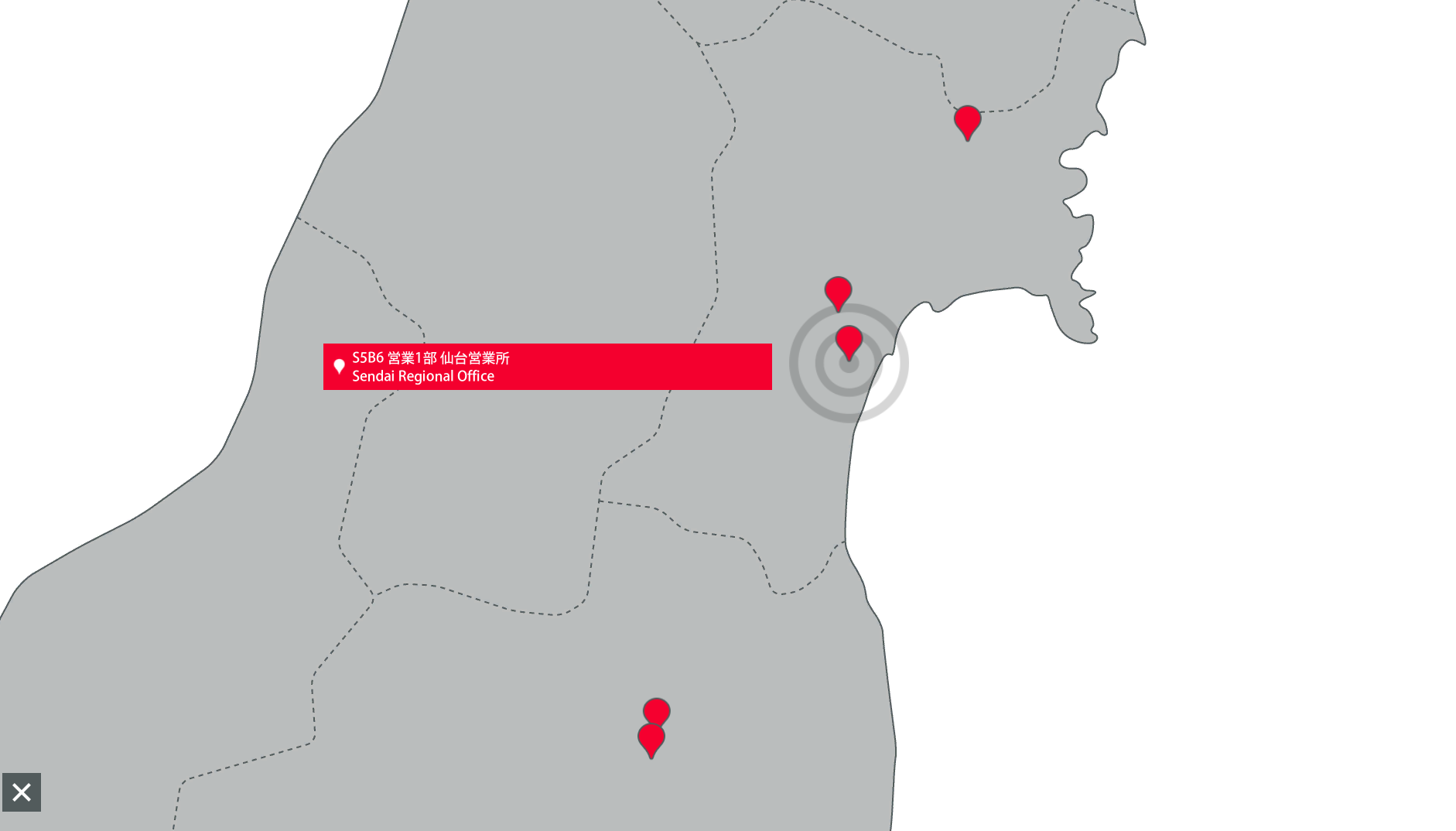 | 11 | 日本 | 38.2585907 | 140.8841867 | S5B6 | 営業1部 仙台営業所 | 宮城県仙台市宮城野区榴岡4丁目5番22号 宮城野センタービル4F | 北海道、東北エリアでの販売、およびマーケティング活動 | 10 | 概要 | 沿革 | メッセージ | ギャラリー | Free0 日本語 | Free1 日本語 | Free2 日本語 | 2020/09/22 |