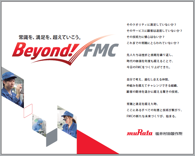 | 福井ムラタの「ありたい姿」 | 福井ムラタの「ありたい姿」 10年後も成長し続けてているためには… ●ムラタ内外の全てのものを吸収(Input)して、新しい技術を生み出し、人、組織は変わり続ける。 ●技術・人材・組織を他事業所にOutputし、ムラタ全体の大きな変革のエンジンの一つとなる。 ●お客様、地域、関係会社、他のステークホルダーから選ばれ、全ての従業員がいきいきと活躍している事業所になっていたい。 の3つの項目の実現を目指しています。 ”Beyond FMC” のキャッチコピーのもと社員一人ひとりが、現状を満足せず、積極的にチャレンジしていきます。 | JP-21_FMC_2019_catch_copy.PNG | ダウンロード |