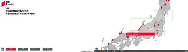 | 24 | 日本 | 35.382462 | 132.817219 | IMC | Izumo Murata Manufacturing Co., Ltd. | Hikawa-cho,Izumo-shi,Shimane Pref, Japan | Development and production of chip Monolithic Ceramic Capacitors | 4909 | Outline | History | Message | Gallery | MIM確認用シート | Free1 英語 | Free2 英語 | 2025/10/14 |