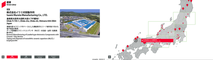 | 25 | 日本 | 35.207334 | 132.501723 | IMC | 株式会社出雲村田製作所 イワミ工場 | 島根県大田市大田町大田イ795番地1 | セラミックをベースにした機能素子にリード線を取り付けた電子部品の製造、チップ型積層セラミックコンデンサ(MLCC)の包装・出荷 | 602 | 概要 | 沿革 | メッセージ | ギャラリー | MIM確認用シート | Free1 日本語 | Free2 日本語 | 2025/10/14 |