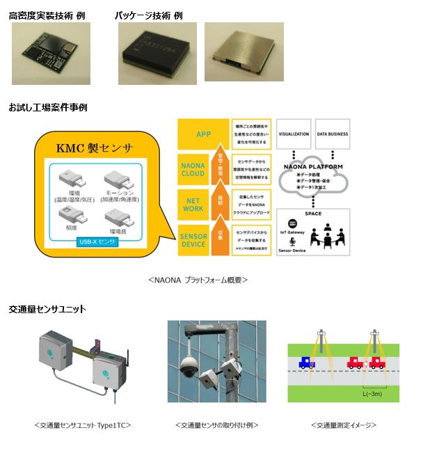 | 「お試し工場」紹介 | ●「お試し工場」紹介 KMCでは、今まで多種・多様な商品を手掛けてきた経験・知見を新商品の創出に活かすことを目的として、2011年より「KMCお試し工場」の活動をスタートしており、数多くの新商品立上げに貢献しています。 開発者の想い、アイデアの実現に向けてお手伝いします。 工法・工程の検討、製品見積り、初期試作を実施します。 ●KMCのコア技術 高密度実装技術 SMD実装の微細化、高密度化に対応する高精度マウンターから、様々な異形部品に対応するマウンターまで部品実装に関するあらゆるニーズにお応えいたします。 パッケージ技術 用途、形状に合わせて、樹脂モールド、金属ケースのほか筐体組込みまで様々なパッケージ技術で対応いたします。 部品内蔵技術 ムラタ独自の部品内蔵技術により、モジュールの低背化、小型化を低コストで実現。 お試し工場案件事例 NAONA :雰囲気データが売れる?・・見えないものを可視化します。 “NAONA”は場の雰囲気や盛り上がり、人間同士の親密度などを計測・判別し、それらを可視化したデータとして提供するプラットフォームサービスです お試し工場は、NAONAで使用されるUSB–Xセンサの工程設計、工法のアドバイス、試作流動支援を行ってきました。 Type1TC: 交通量データが売れる?・・・交通センサユニットは交通情報をデータ化します。 交通量センサユニットType1TCは路上に設置し交通量をカウントする装置です 交通量センサユニットの開発においては、本社開発部門(E2N)が回路ハード設計、横浜設計部門(N6F5)が筐体設計(製品外側の箱の構造や耐久性の設計)、KMCは工程設計と梱包形態設計、試作製造とを担当しています。各部門との密な連携と情報共有を行い、開発を進めてきました。 | JP-29_1-2OTAMESHI.JPG | ダウンロード |