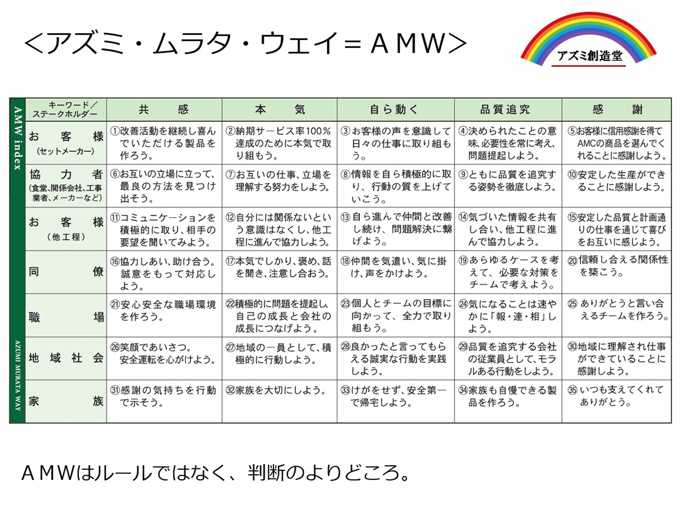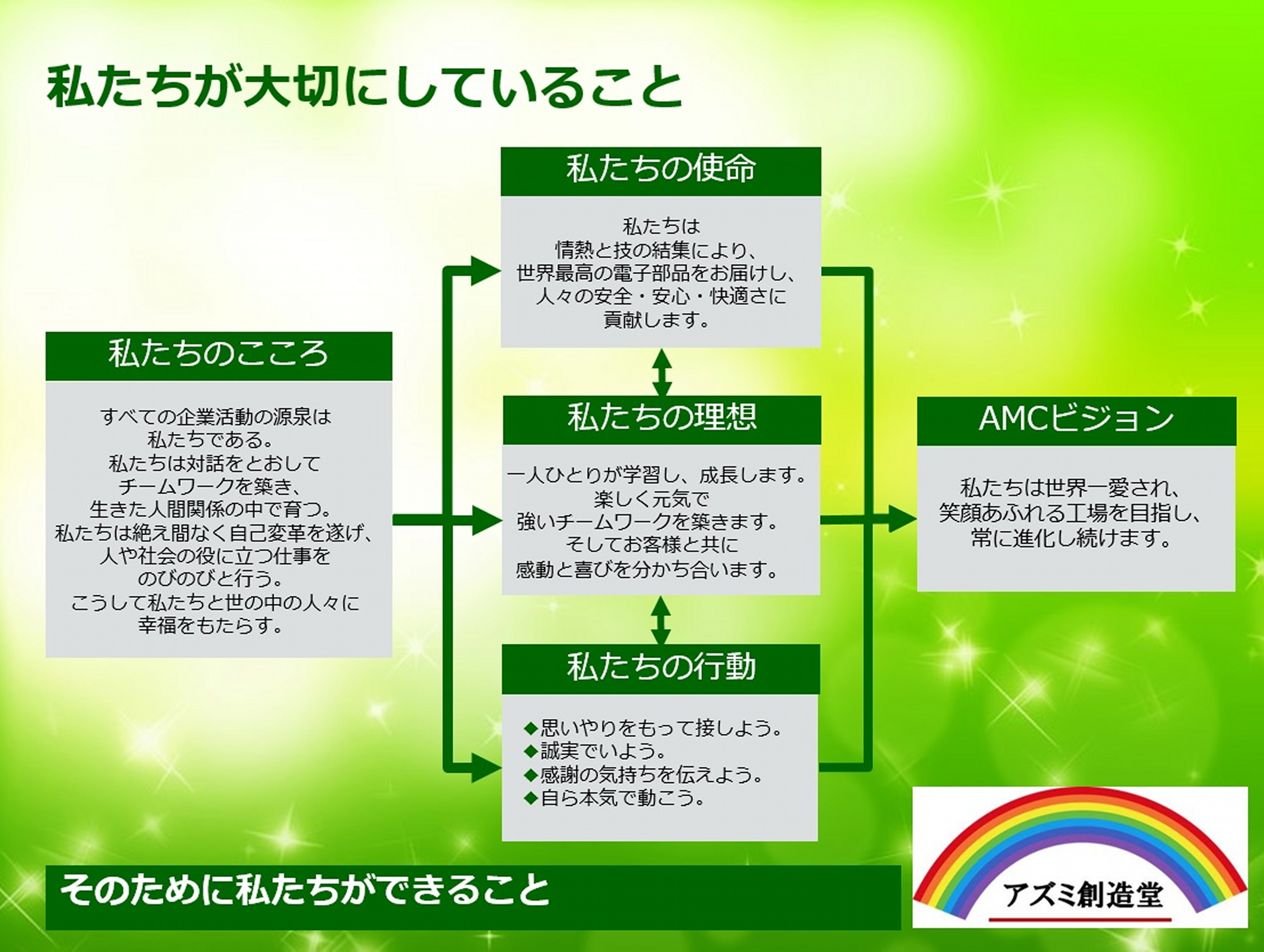 | アズミ創造堂_ASD | 社是を実践するためには、私たちの行動を呼び覚ますより具体的な理念が必要だと考えました。 まず、私たちは「なぜアズミ村田製作所で働くのか?」の意味を考えながら事業理念を策定するプロジェクトチーム【アズミ創造堂】を発足させました。従業員全員が研修を受け、各課の代表者が意見をとりまとめました。それが、社是をベースとした『私たちのこころ』『私たちの使命』『私たちの理想』『私たちの行動』『AMCビジョン』です。 | JP-38_AMC1ASDgreen.jpg | ダウンロード |