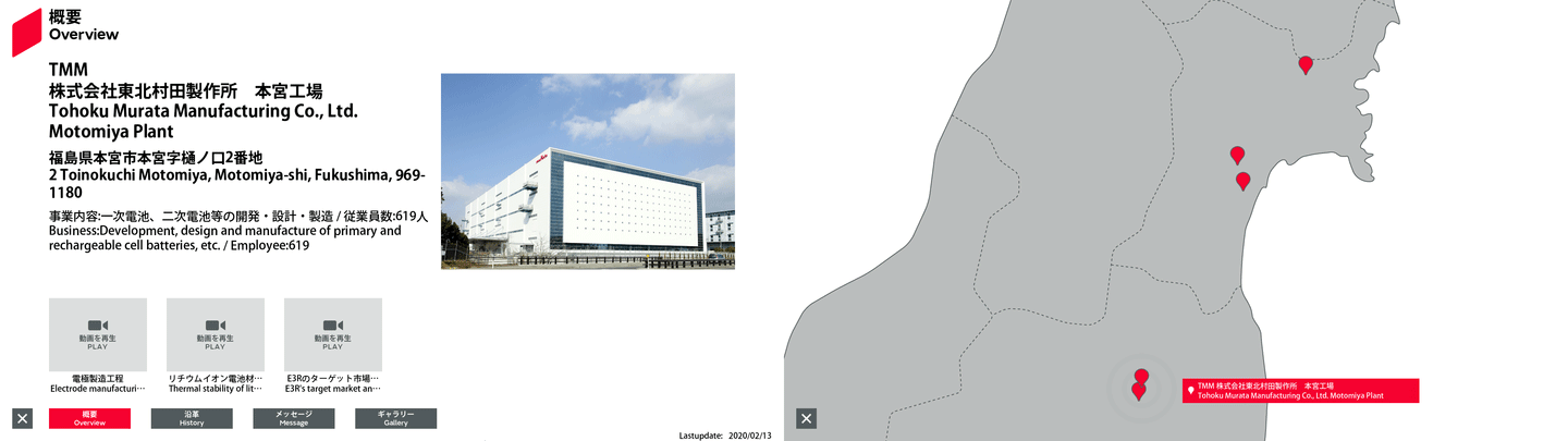 | 51 | 日本 | 37.5254371 | 140.3913321 | TMM | Tohoku Murata Manufacturing Co., Ltd. Motomiya Plant | 2 Toinokuchi Motomiya, Motomiya-shi, Fukushima, 969-1180 | Development, design and manufacture of primary and rechargeable cell batteries, etc. | 530 | Outline | History | Message | Gallery | Free0 英語 | Free1 英語 | Free2 英語 | 2025/10/14 |