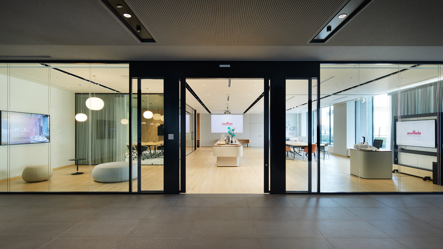 | Murata Interactive Communication Space | Murata Interactive Communication Space will promote open innovation that creates new value and sparks new business creation through collaboration with diverse customers across industries. Visitors can experience exhibits that will lead to the technologies and applications of the future. Events of up to 100 people, such as technology exchange meetings, can be held to stimulate idea creation. | JP-53_murata_mm_5F_008.jpg | ダウンロード |