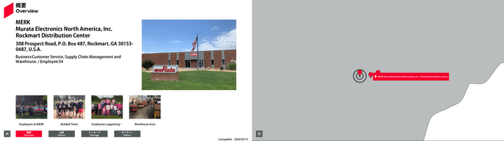 | 10 | アメリカ | 34.013953 | -85.06332 | MERK | Murata Electronics North America, Inc. Rockmart Distribution Center | 308 Prospect Road, P.O. Box 487, Rockmart, GA 30153-0487, U.S.A. | Customer Service, Supply Chain Management and Warehouse. | 47 | Outline | History | Message | Gallery | Free0 英語 | Free1 英語 | Free2 英語 | 2025/03/21 |