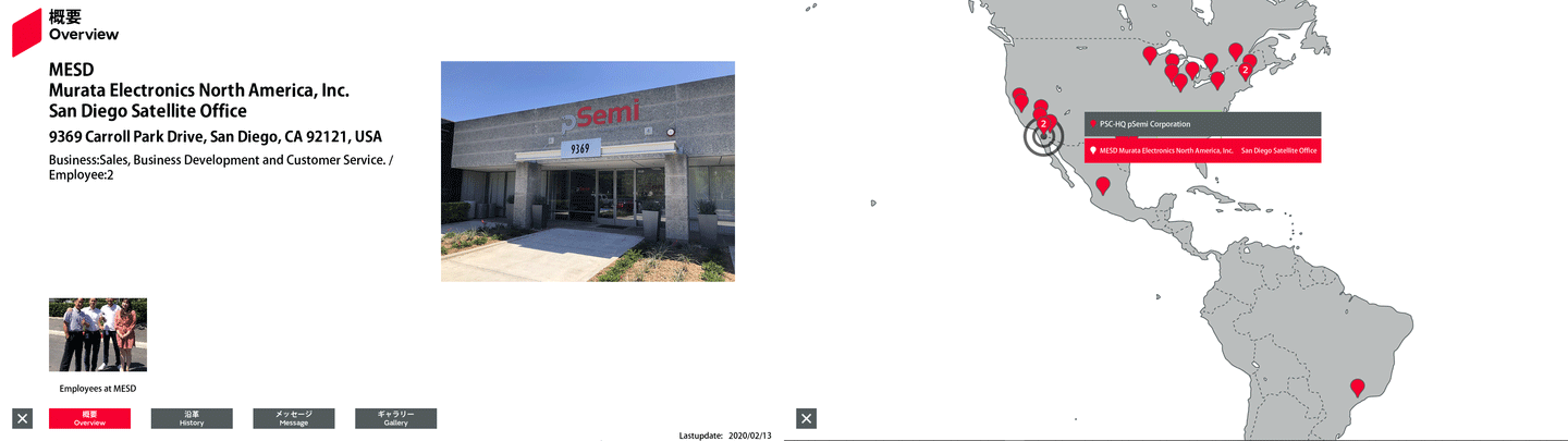 | 11 | アメリカ | 32.713028 | -116.617655 | MESD | Murata Electronics North America, Inc. San Diego Satellite Office | 9369 Carroll Park Drive, San Diego, CA 92121, USA | Sales, Business Development | 4 | Outline | History | Message | Gallery | Free0 英語 | Free1 英語 | Free2 英語 | 2025/03/21 |