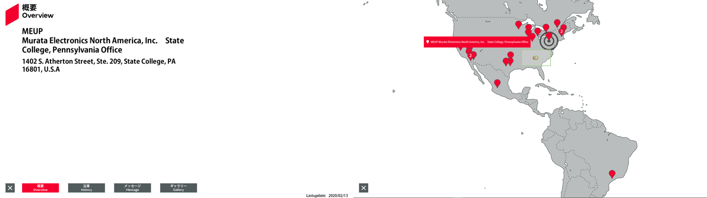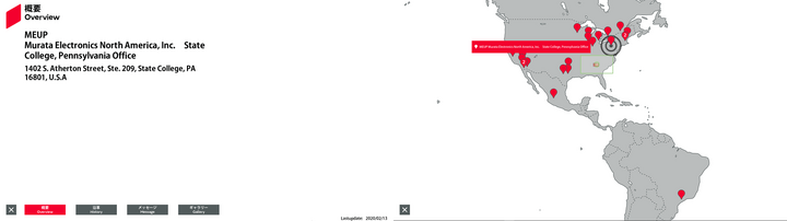 | 13 | アメリカ | 40.78434 | -77.840982 | MEUP | Murata Electronics North America, Inc. State College, Pennsylvania Office | 1402 S. Atherton Street, Ste. 209, State College, PA 16801, U.S.A | 0 | Overview | History | Message | Gallery | Free0 英語 | Free1 英語 | Free2 英語 | 2020/09/22 |