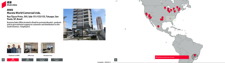 | 15 | アメリカ | -23.543805 | -46.572096 | MWB | Murata World Comercial Ltda. | Rua Tijuco Preto, 393, Sala 151/152/153, Tatuape, Sao Paulo, SP, Brazil | Sales Office located in Brazil to promote Murata's products and to give technical support to customers and distribuitors in the South America. | 3 | Overview | History | Message | Gallery | Free0 英語 | Free1 英語 | Free2 英語 | 2020/09/21 |