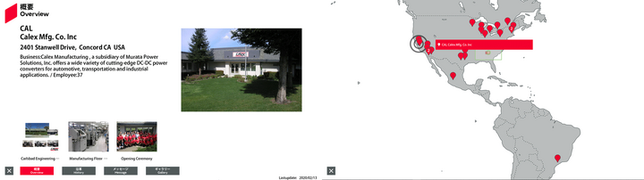 | 19 | アメリカ | 37.984052 | -122.049019 | CAL | Calex Manufacturing Co., Inc. | 2401 Stanwell Drive, Concord CA USA | Calex Manufacturing, a subsidiary of Murata Power Solutions, offers a range of leading-edge DC-DC converters, AC-DC power supplies, and battery chargers for automotive, transportation, robotics and industrial applications. | 30 | Outline | History | Message | Gallery | Free0 英語 | Free1 英語 | Free2 英語 | 2021/09/28 |