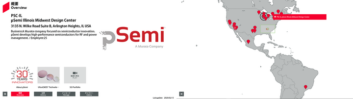 | 22 | アメリカ | 42.133184 | -88.00175 | PSC-IL | PSC-IL pSemi Midwest Design Center | 3135 N. Wilke Road Suite B, Arlington Heights, IL USA | A Murata company focused on semiconductor innovation. pSemi develops high-performance semiconductors for RF, power management, and mixed-signal. | 27 | Overview | History | Message | Gallery | Free0 英語 | Free1 英語 | Free2 英語 | 2025/01/20 |