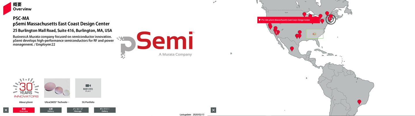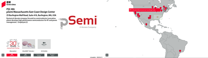 | 24 | アメリカ | 43.699839 | -70.611259 | PSC-MA | pSemi Massachusetts East Coast Design Center | 25 Burlington Mall Road, Suite 416, Burlington, MA, USA | A Murata company focused on semiconductor innovation. pSemi develops high-performance semiconductors for RF and power management. | 22 | Overview | History | Message | Gallery | Free0 英語 | Free1 英語 | Free2 英語 | 2020/09/21 |