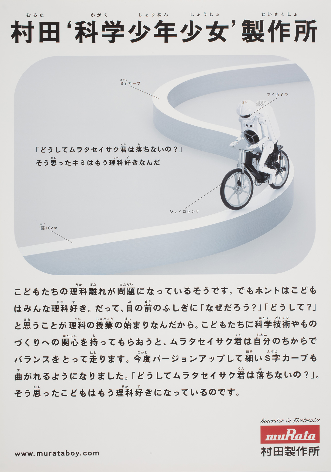 2005年度 《村田顽童在你身边》 由于新开发的第二代村田顽童得到了较高的关注度和人气,进一步提高企业的一流评价就成为了村田广告的目标。同时作为CSR因素,通过对孩子们“疏远理科”的现象敲响警钟,引发孩子们对理科的兴趣,强调了村田要为社会贡献力量的态度。 ad_08_2005.jpg ダウンロード