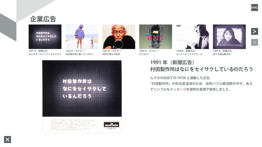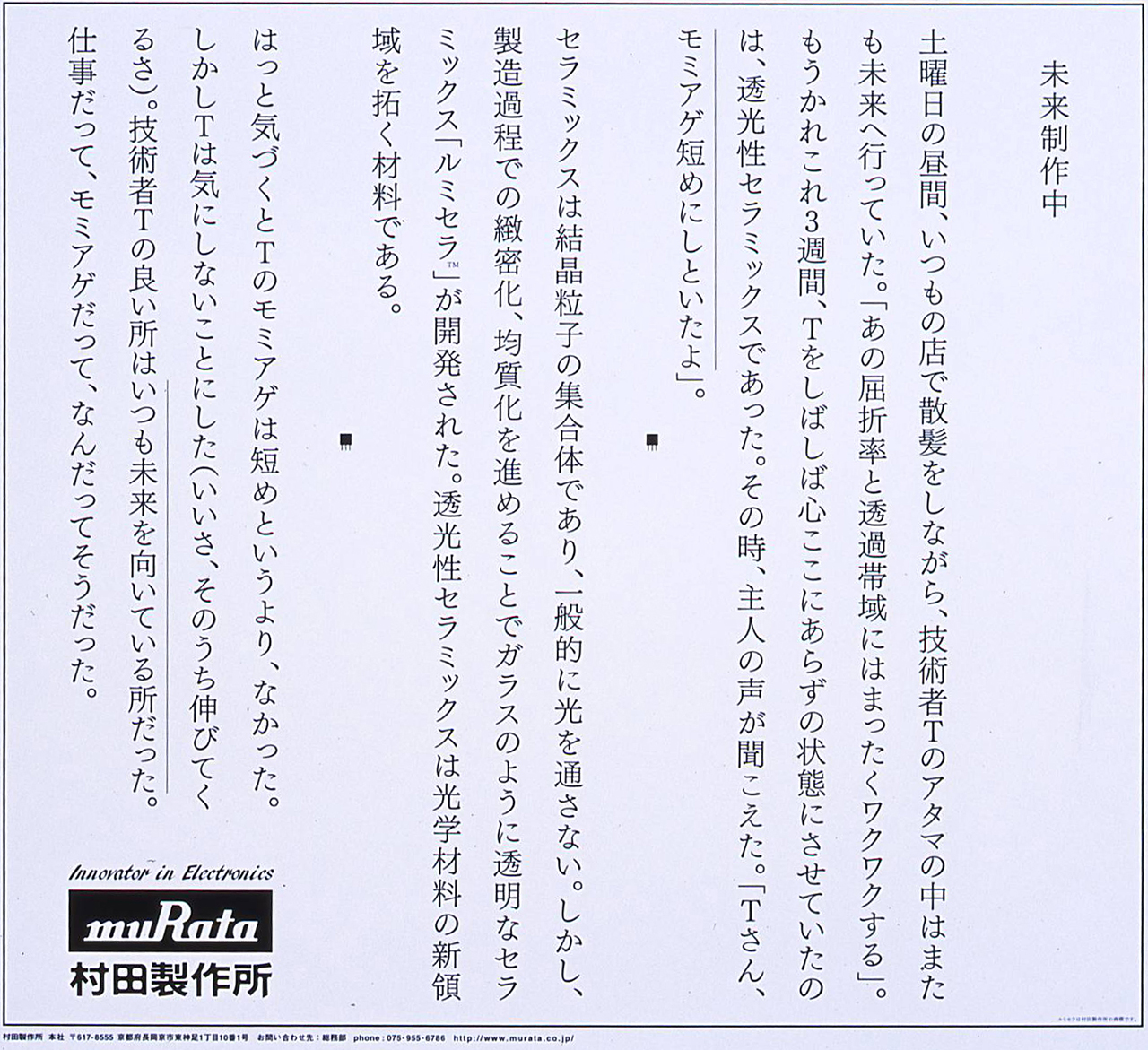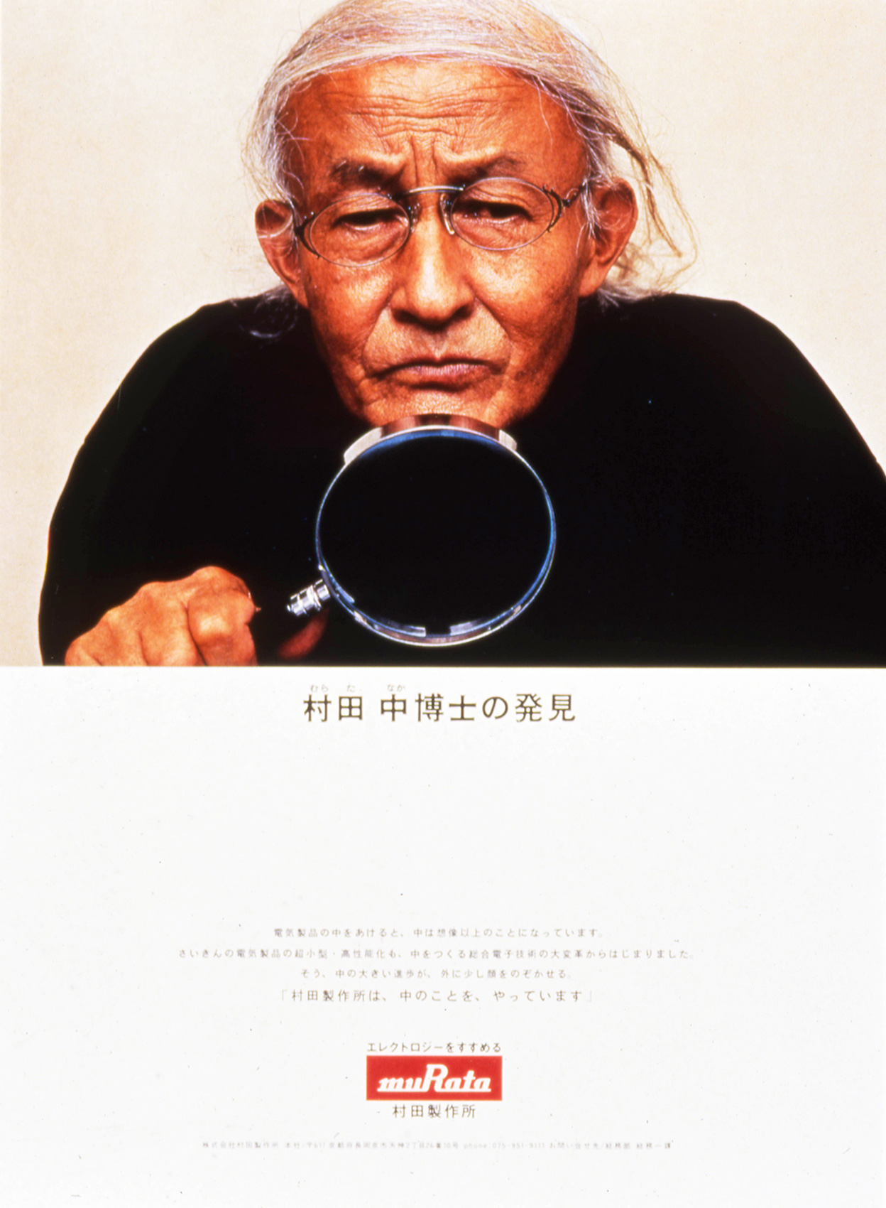1993年度 《村田制作所在专注于内部的制作》 作为对1991年的宣传词“村田制作所在制作什么?”的回答,本次打出的宣传词是“村田制作所在专注于内部的制造”。对于“元件”这个难以产生联想的主题,用“内部”而非“外部”、“事情”而非“东西”来表现出村田专注于看不见的机能中,将这一特点体现在了广告中。 ad_03_1993.jpg ダウンロード