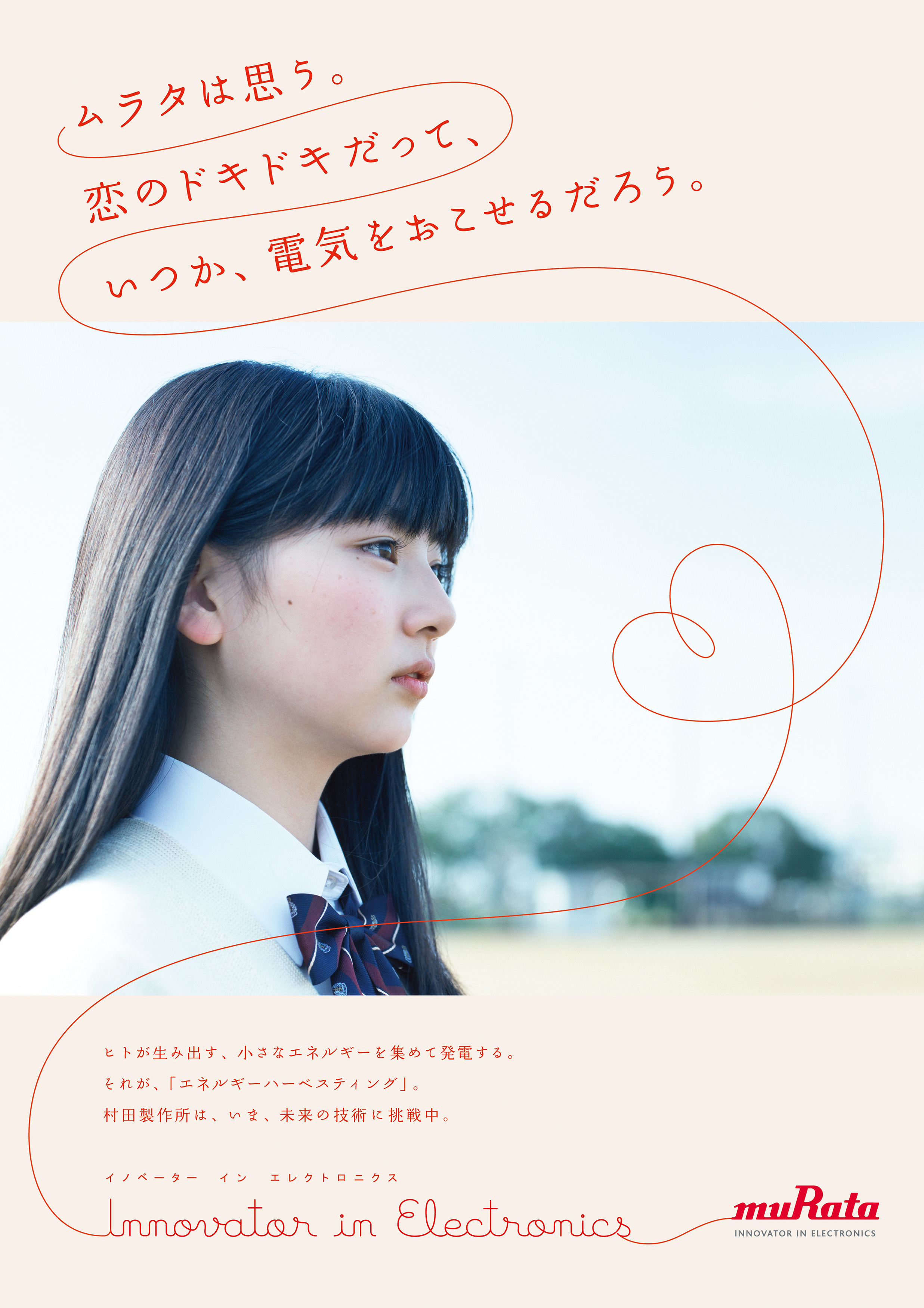 2012年度・2013年度 《村田在思考。正如恋爱时的怦然心动,终有一天也能产生电能。》 为了宣传村田的未来志向,找出了将热量、振动转换为能量的技术和女孩子在“恋爱的怦然心动”上的共同之处,以此体现元件将会改变未来。 ad_11_2012.jpg ダウンロード