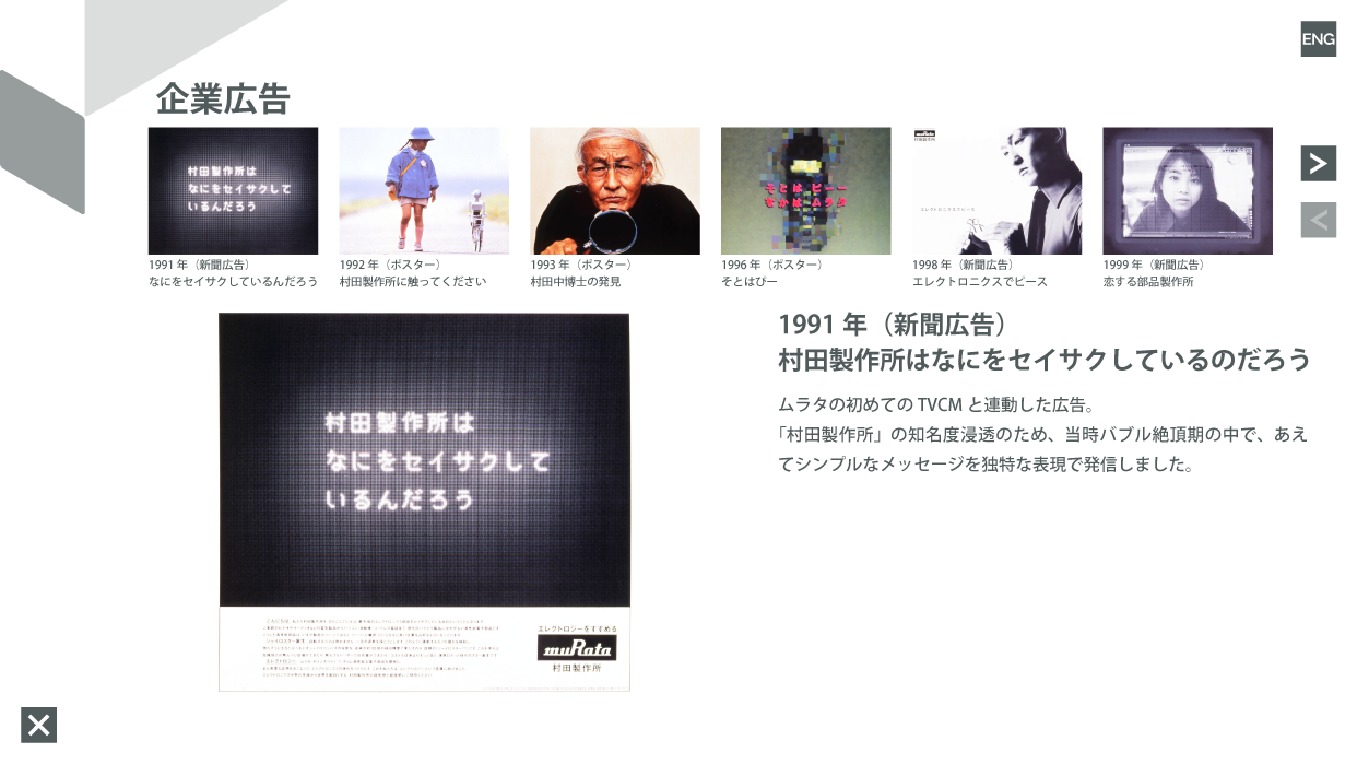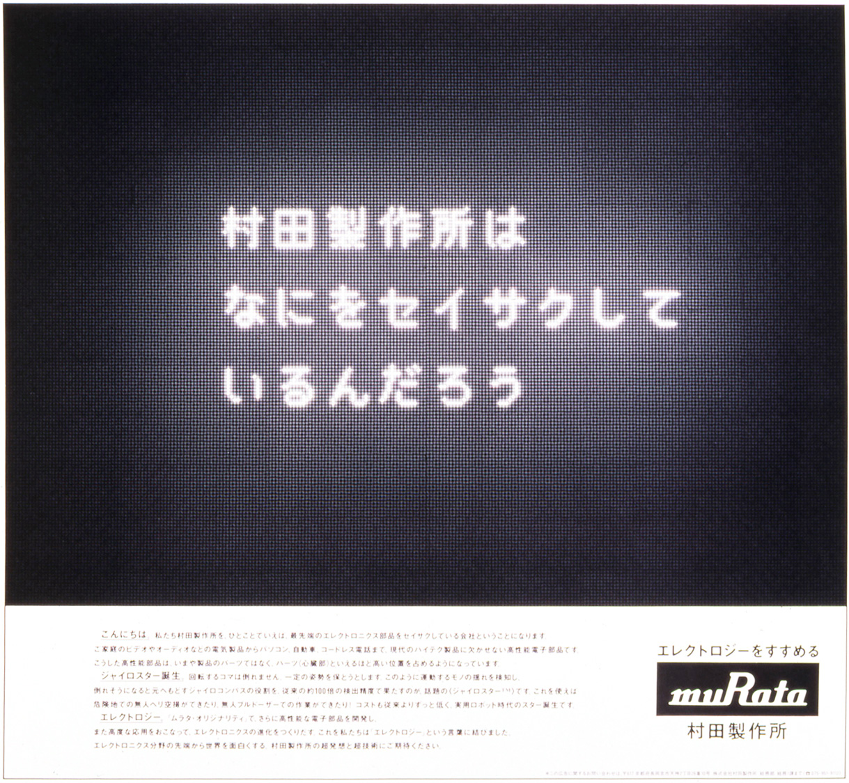 1991年度 《村田制作所在制造什么?》 村田泰隆就任第二代社长后,开始正式大规模推行公司广告,制定了以先提升知名度(对公司名的知晓比例),再提高认知度(对公司业务的认知比例)为目标的方针,并为提升知名度,打出了“世界上有一家名为村田制作所的公司”“我们是一家在制造某样产品的‘制造商’”这样的宣传词。 ad_01_1991.jpg ダウンロード