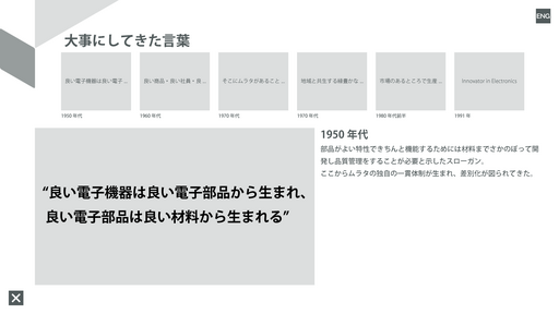 1950s “优质的电子设备源于优质的电子元件,优质的电子元件源于优质的材料” 1950s 该标语表达了为使元件具有良好的特性并且能够充分发挥其性能,需要回溯到材料,进行开发、实施质量管理。由此诞生了村田特有的一贯性生产体制,并借此谋求差异化。