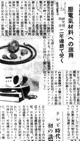 | List_R02 | 朗之万型压电陶瓷谐振器 | 以具有施加电压后可以伸缩、施加压力则会产生电力的特性的压电陶瓷为材料。为了降低谐振器的频率,采用了从两端将金属板焊接在压电陶瓷元件上的构造,实现了世界最初的使用了钛酸钡谐振器的鱼群探测器的产品化。 |