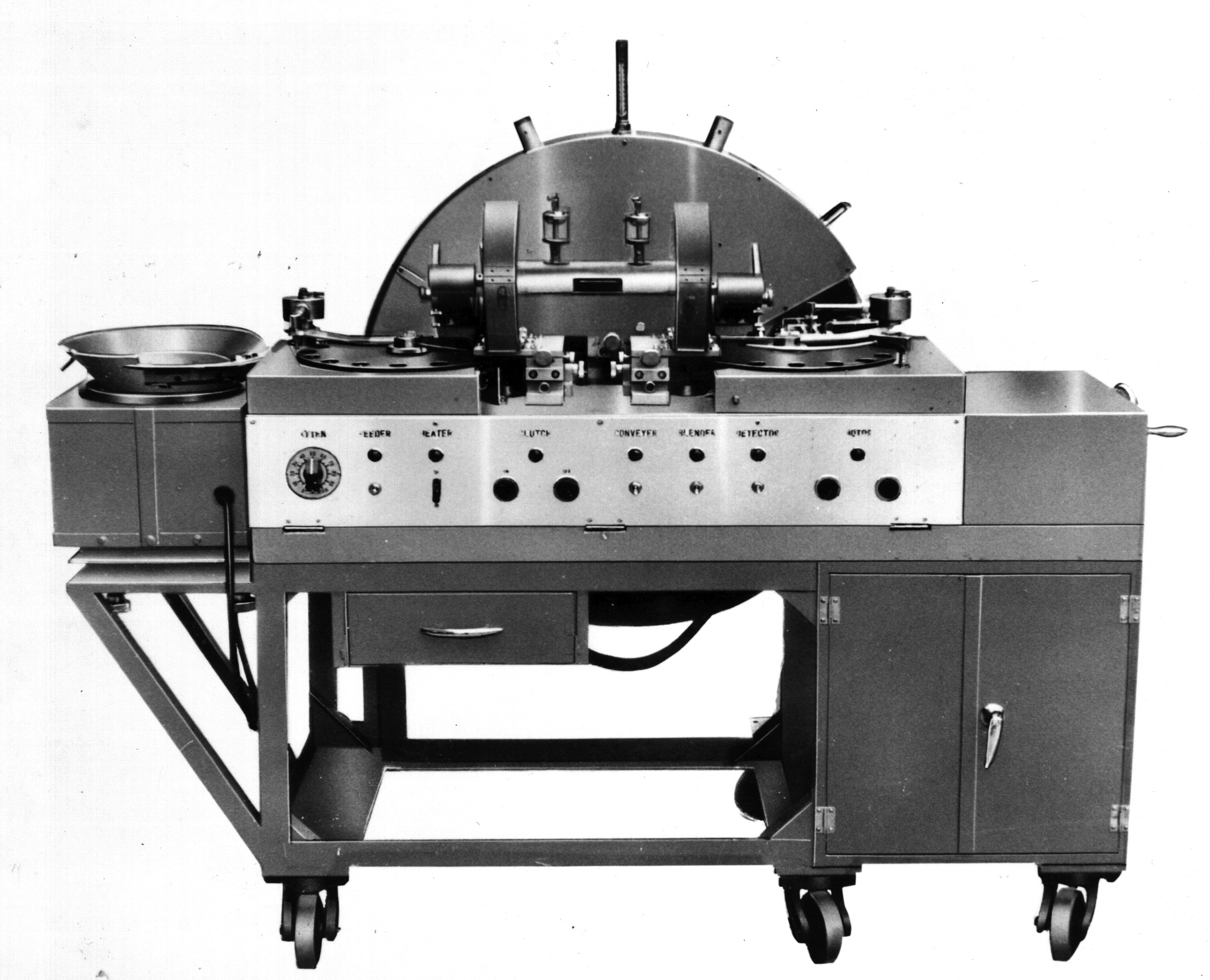 | List_M02 | 1962年开发的全自动双面电极印刷机(ASM)让之前一张一张进行手工作业的电容器电极涂刷及干燥实现了自动化。凭借ASM和全自动引线成型、安装机(DLS)以及电容器自动分选机等设备,生产从手工业时代转变为自动化量产时代。 |