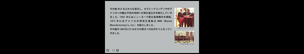 | List_M01 | 1964 独特的生产技术开发历程 | “除产品外,也要对生产技术及生产设备进行自主开发”,基于这种想法,为实现生产设备的内部制造,村田真正开始开发生产技术。这是在村田技研迁移到长冈町后的事情了。 |